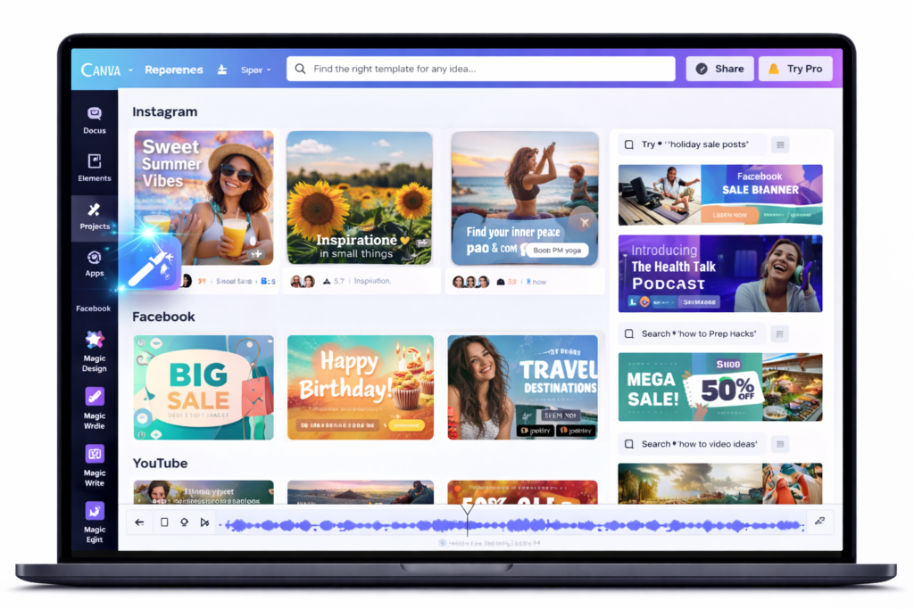 Canva is very important for social media creativity platforms like Instagram posts and stories, Facebook banners, YouTube thumbnails, LinkedIn creatives.