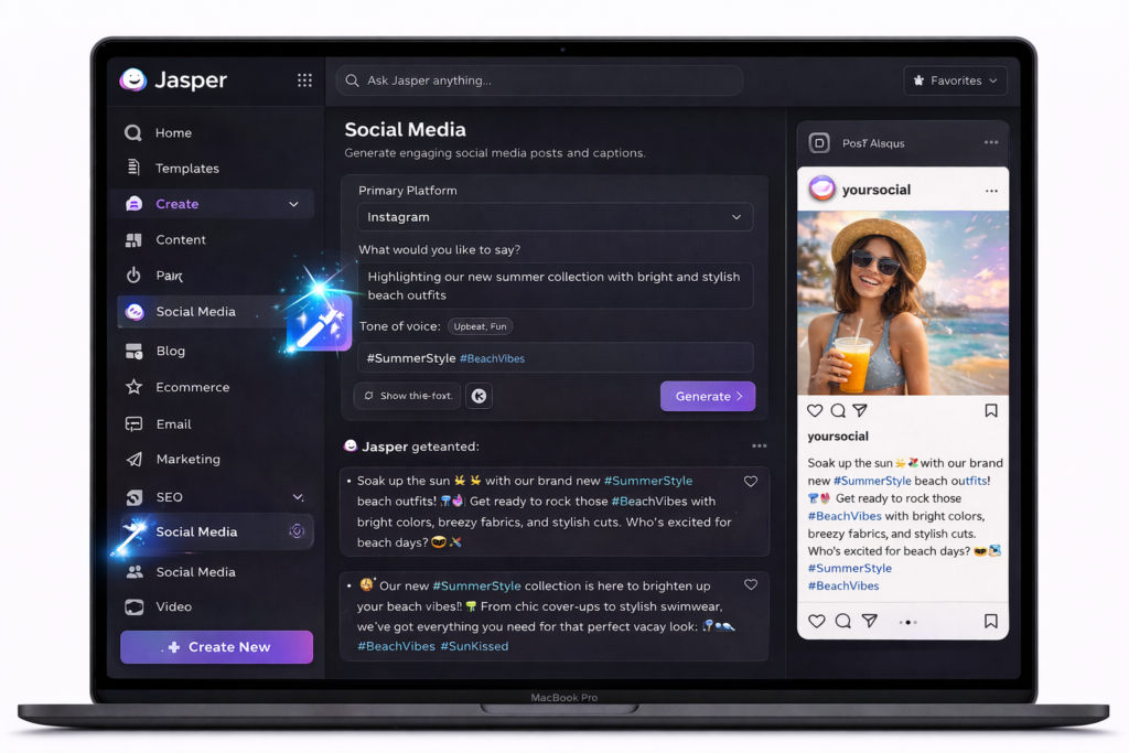 Jasper AI is a favorite for writing captions, hooks, and social media copy.